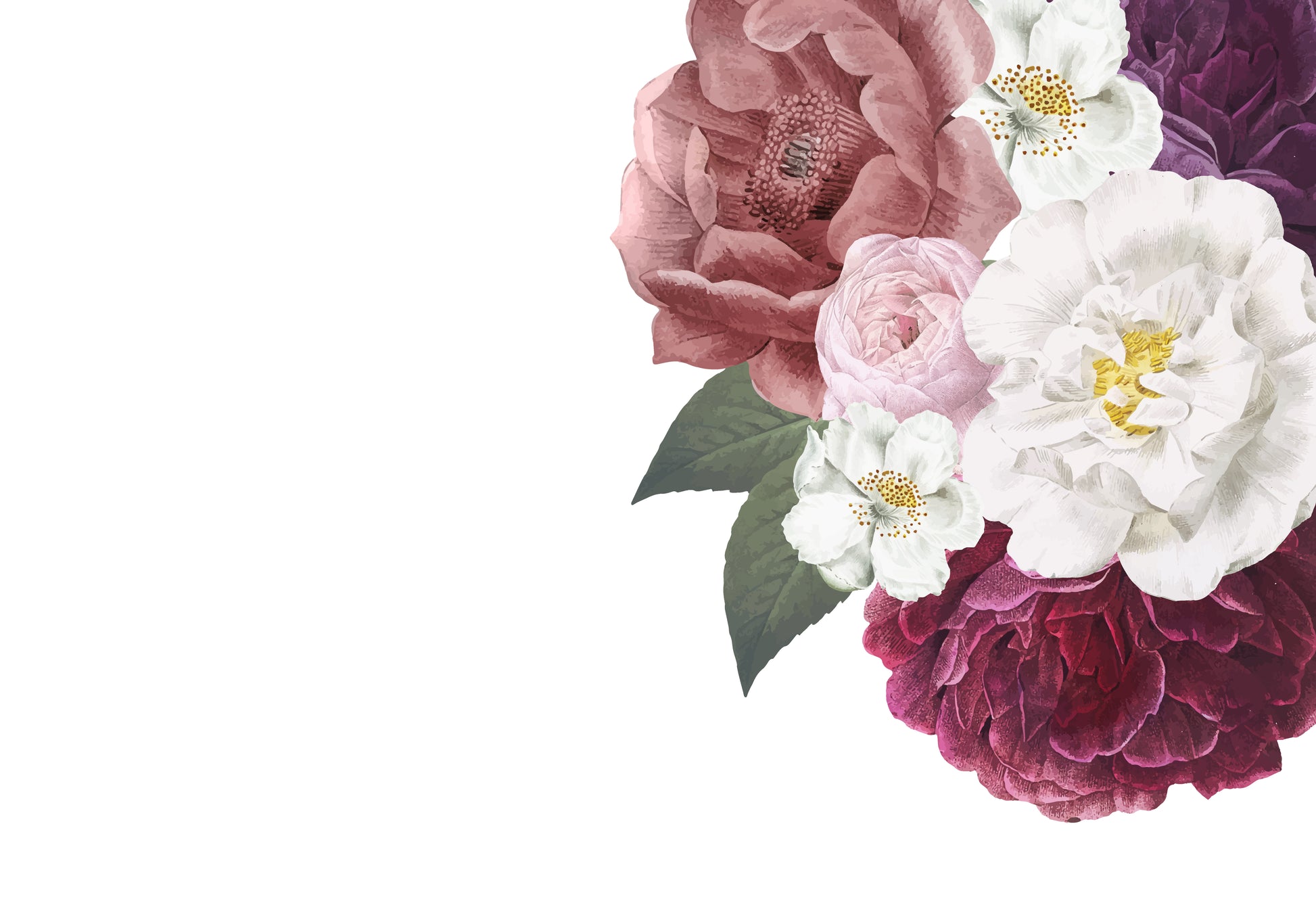 Neutral bedding, pale timber, woven baskets, and soft blush cushions to balance the ruby tones. Add a few scattered floral decals to build a fuller garden scene.